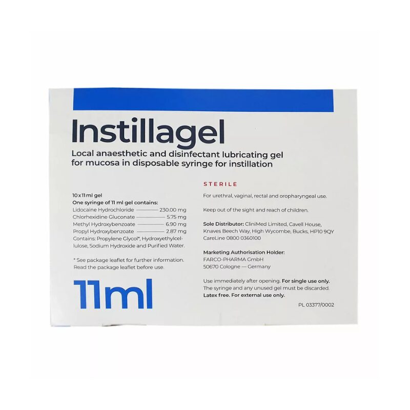 Instillagel contains a combination of lidocaine hydrochloride, an effective local anaesthetic that numbs the area, and chlorhexidine, a powerful antiseptic that helps to prevent infection. This dual-action formula ensures comfort and safety during medical examinations and treatments.